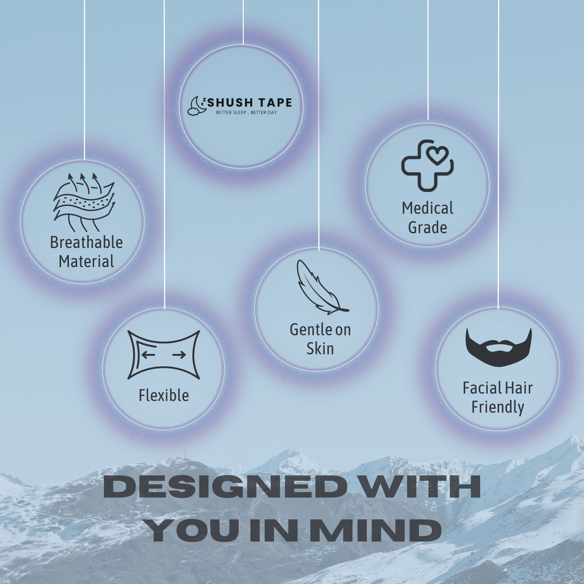 Our hypoallergenic tape gently seals your lips, encouraging nasal breathing. The built-in perforation allows safe pressure relief without uncomfortable suction.